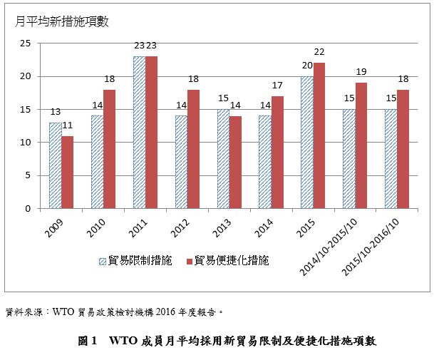 WTO於2016年12月9日發布之貿易政策檢討機構年度報告顯示,在2015年10月中旬至2016年10月中旬的審查期間,WTO成員採用182項新的貿易限制措施,與過去監測報告相同,大多數為進口相關措施(約佔73.1%),其中最普遍的做法是增加進口關稅,而除了進口相關措施之外,另有34項影響出口及15項國內自製率要求之措施。WTO成員平均每月採用15項新的貿易限制性措施,雖較2015年月平均採取20個新限制性措施為低,但其實只是恢復2009年以來新貿易限制措施的趨勢水準。這些限制性措施主要影響的產品為鋼鐵、機械和機械設備、鋼鐵製品、電機及其零組件。