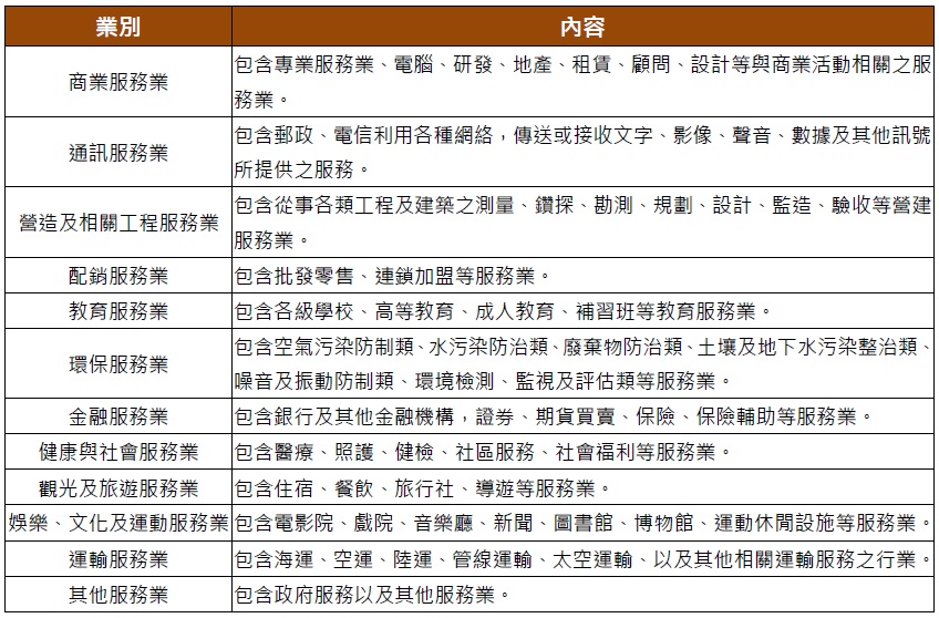 依據世界貿易組織在1991年所發布的服務業分類(GNS/W/120)文件,服務業可分為12大類,分別是︰1. 商業服務業、2. 通訊服務業、3. 營造及相關工程服務業、4. 配銷服務業、5. 教育服務業、6. 環境服務業、7. 金融服務業、8. 健康與社會服務業、9. 觀光及旅遊服務業、10. 娛樂、文化及運動服務業、11. 運輸服務業、12. 其他服務業。目前我國發展較快速的服務業為商業、通訊、配銷和娛樂、文化及運動服務業,而佔GDP比重最高的則是配銷及金融服務業。下表茲說明12項服務業別之內容: