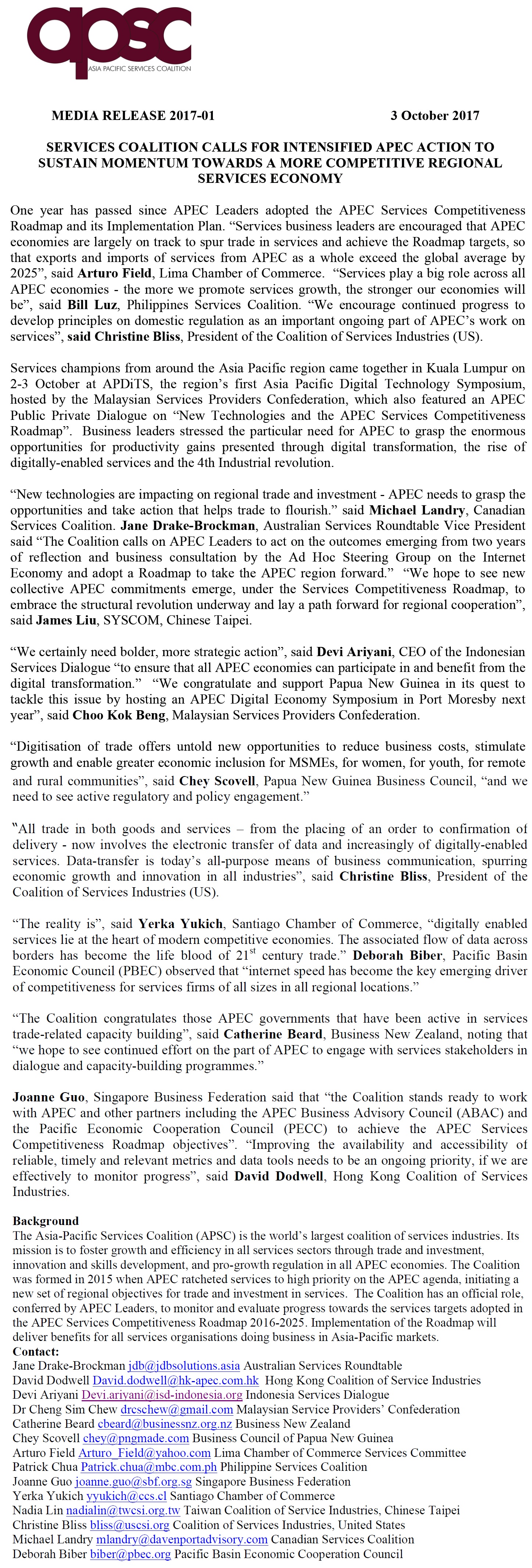 SERVICES COALITION CALLS FOR INTENSIFIED APEC ACTION TO SUSTAIN MOMENTUM TOWARDS A MORE COMPETITIVE REGIONAL SERVICES ECONOMY