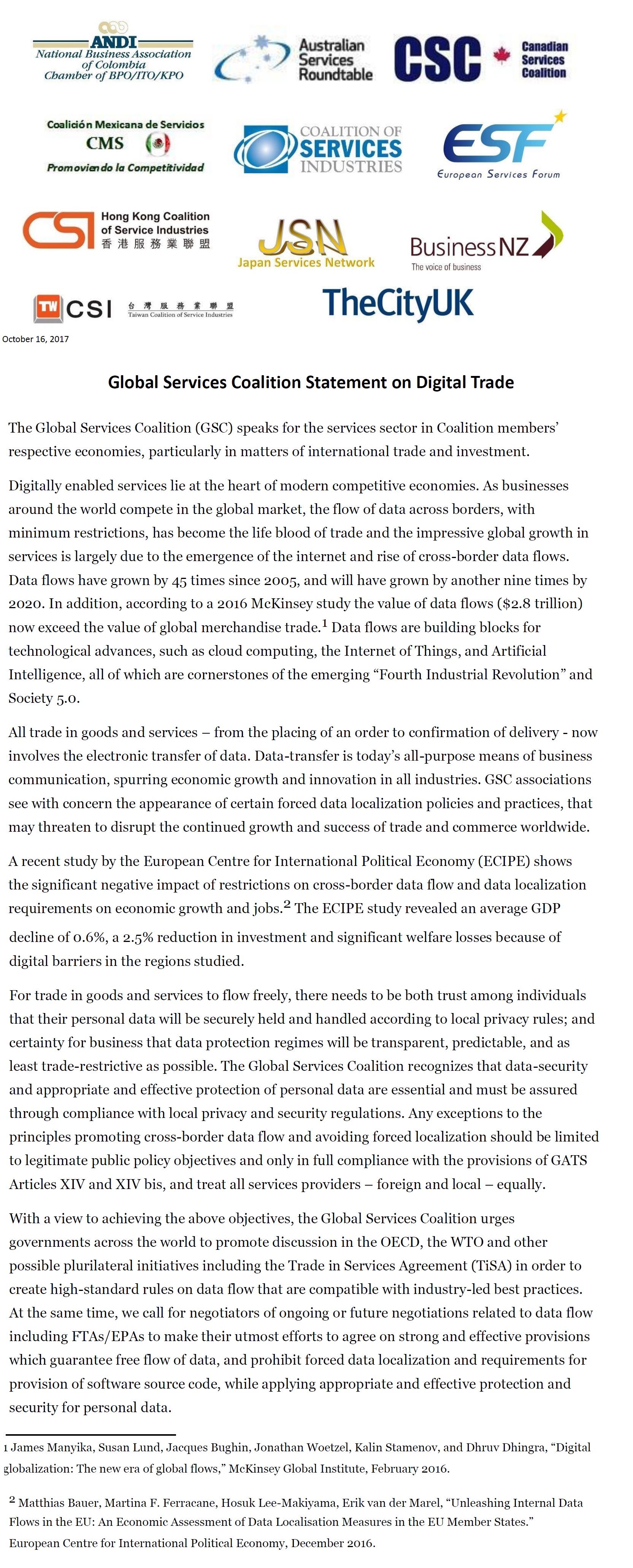 Global Services Coalition Statement on Digital Trade