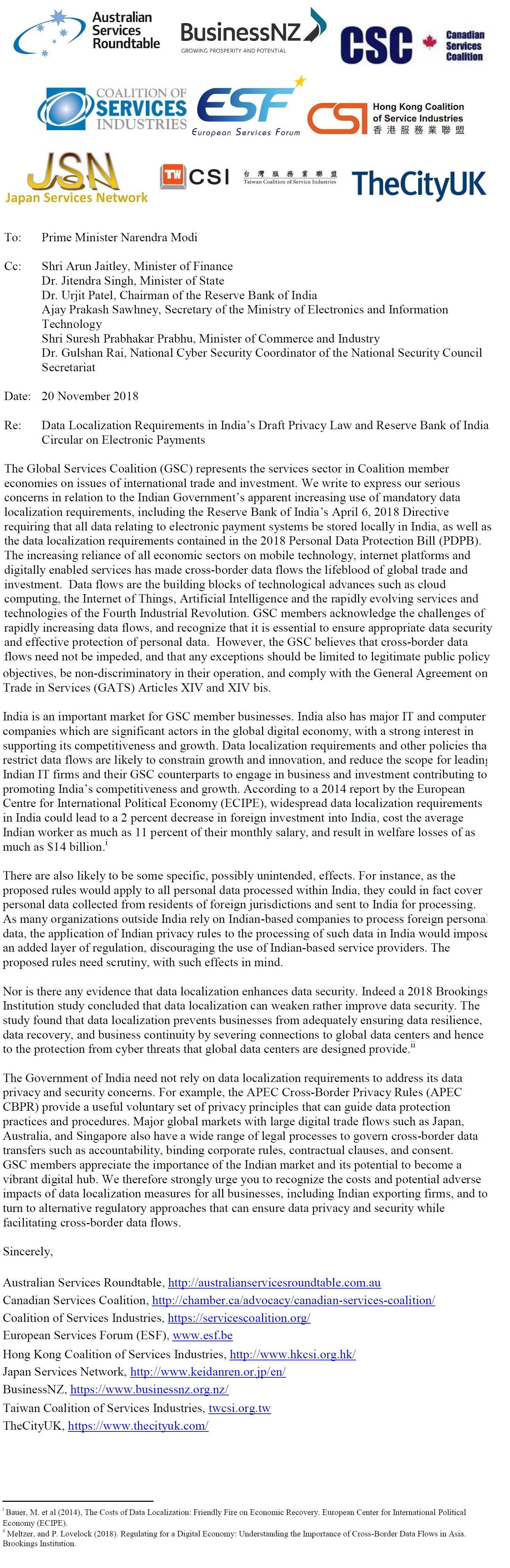 Global Services Coalition Letter to Prime Minister Modi re Data Localization