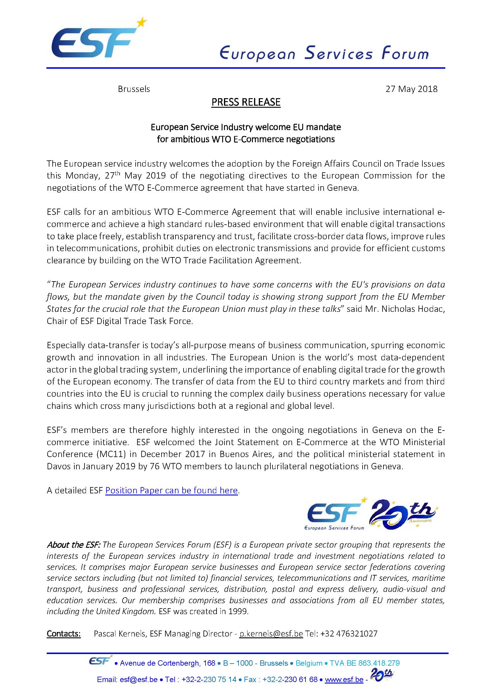 European Service Industry welcome EU mandate for ambitious WTO E-Commerce negotiations