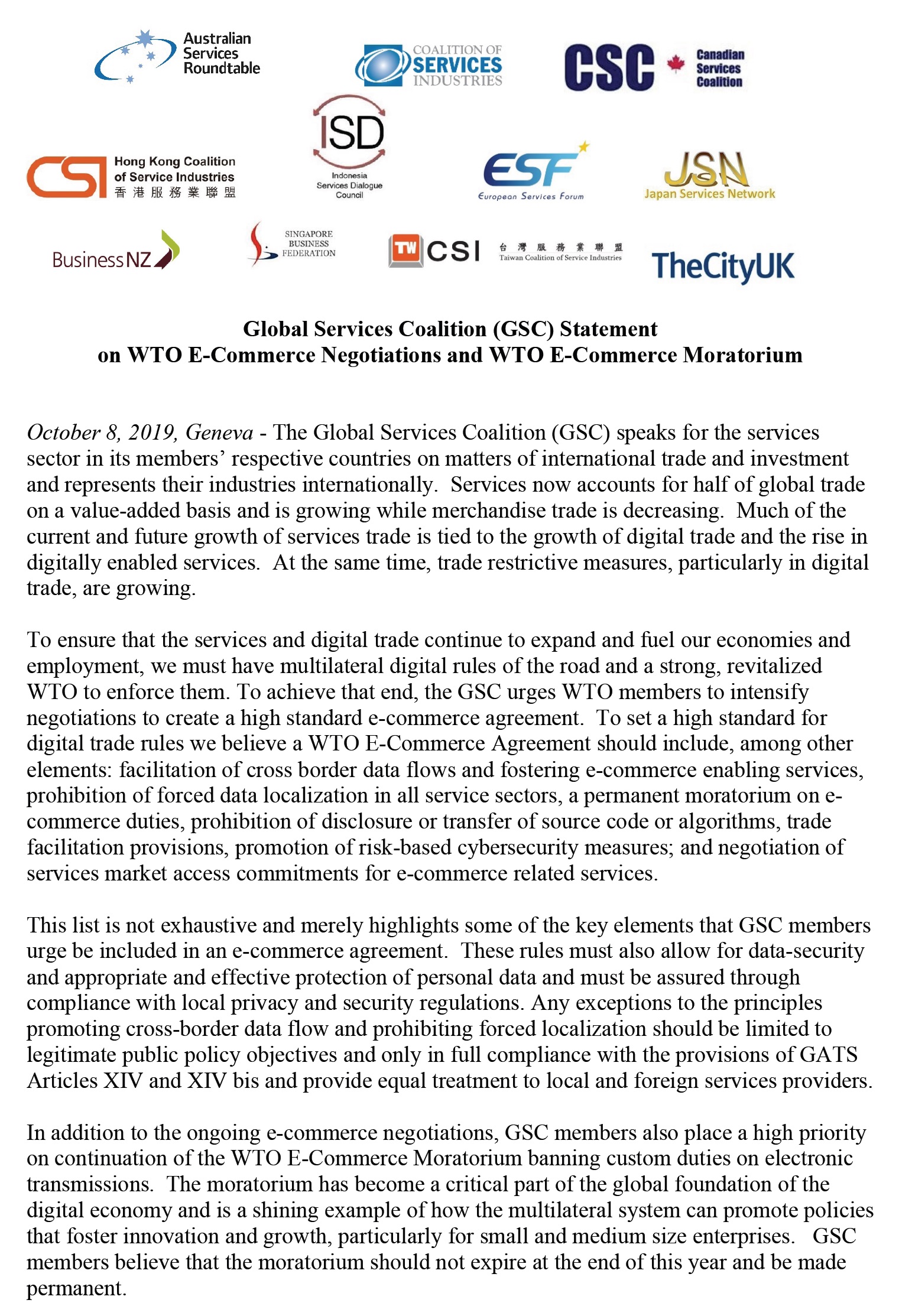 Global Services Coalition(GSC) Statement on WTO E-Commerce Negotiations and WTO E-Commerce Moratorium