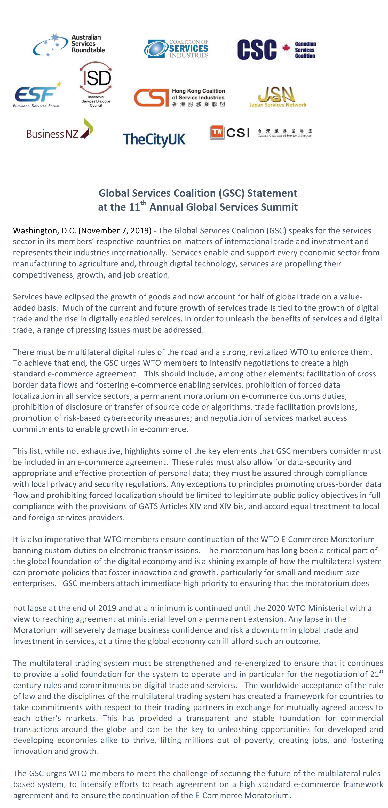Global Services Coalition (GSC) Statement at the 11th Annual Global Services Summit