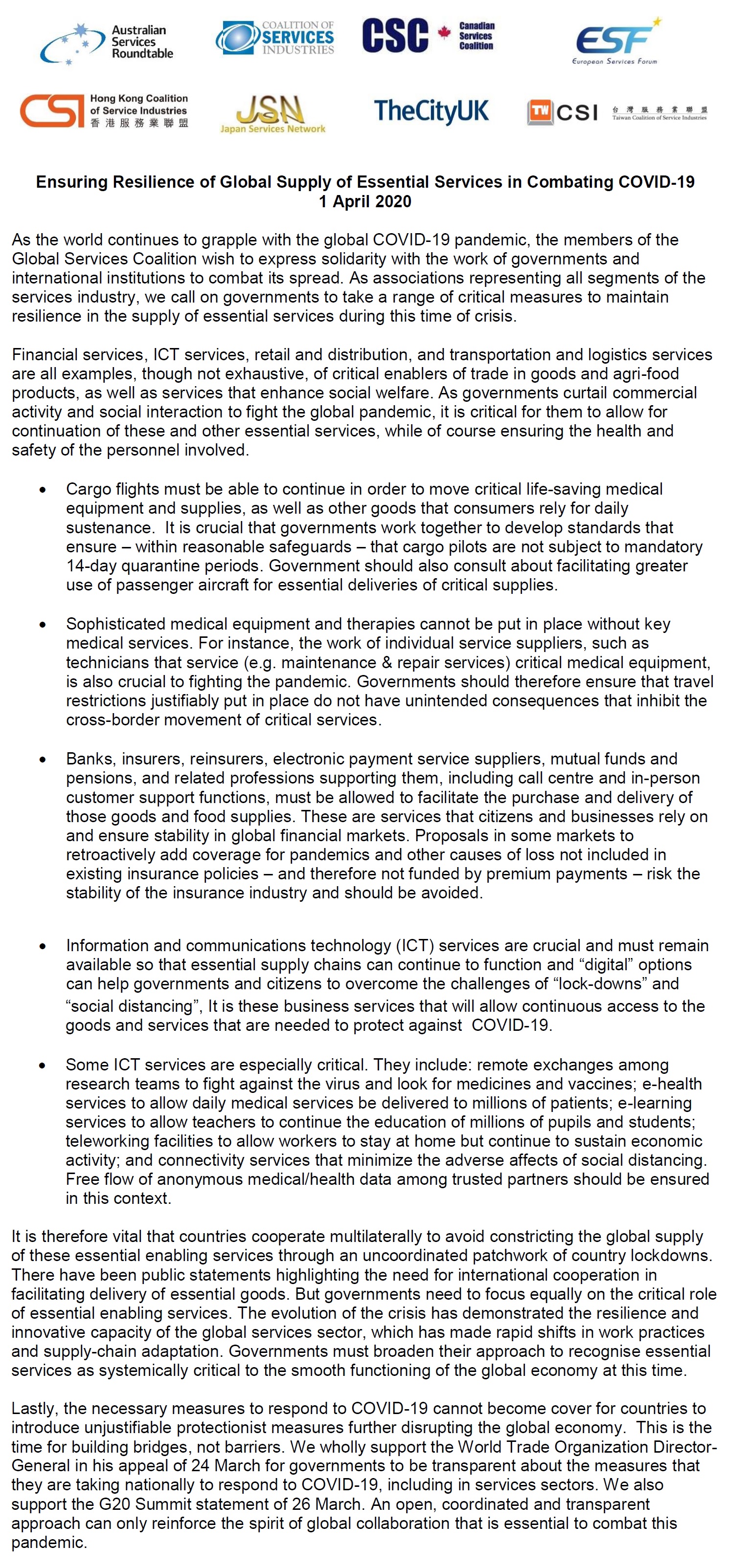 GSC Statement:Ensuring Resilience of Global Supply of Essential Services in Combating COVID-19