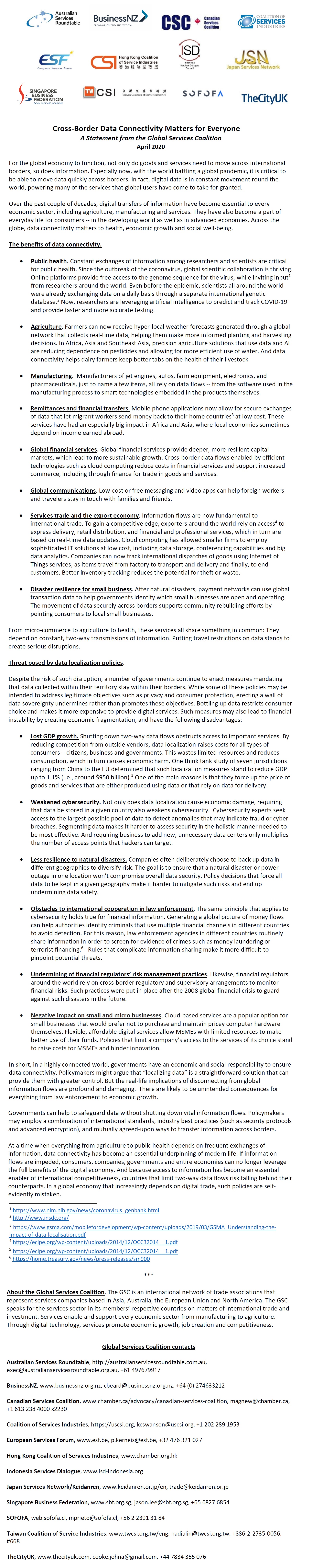 Global Services Coalition (GSC) Statement : Cross-Border Data Connectivity Matters for Everyone