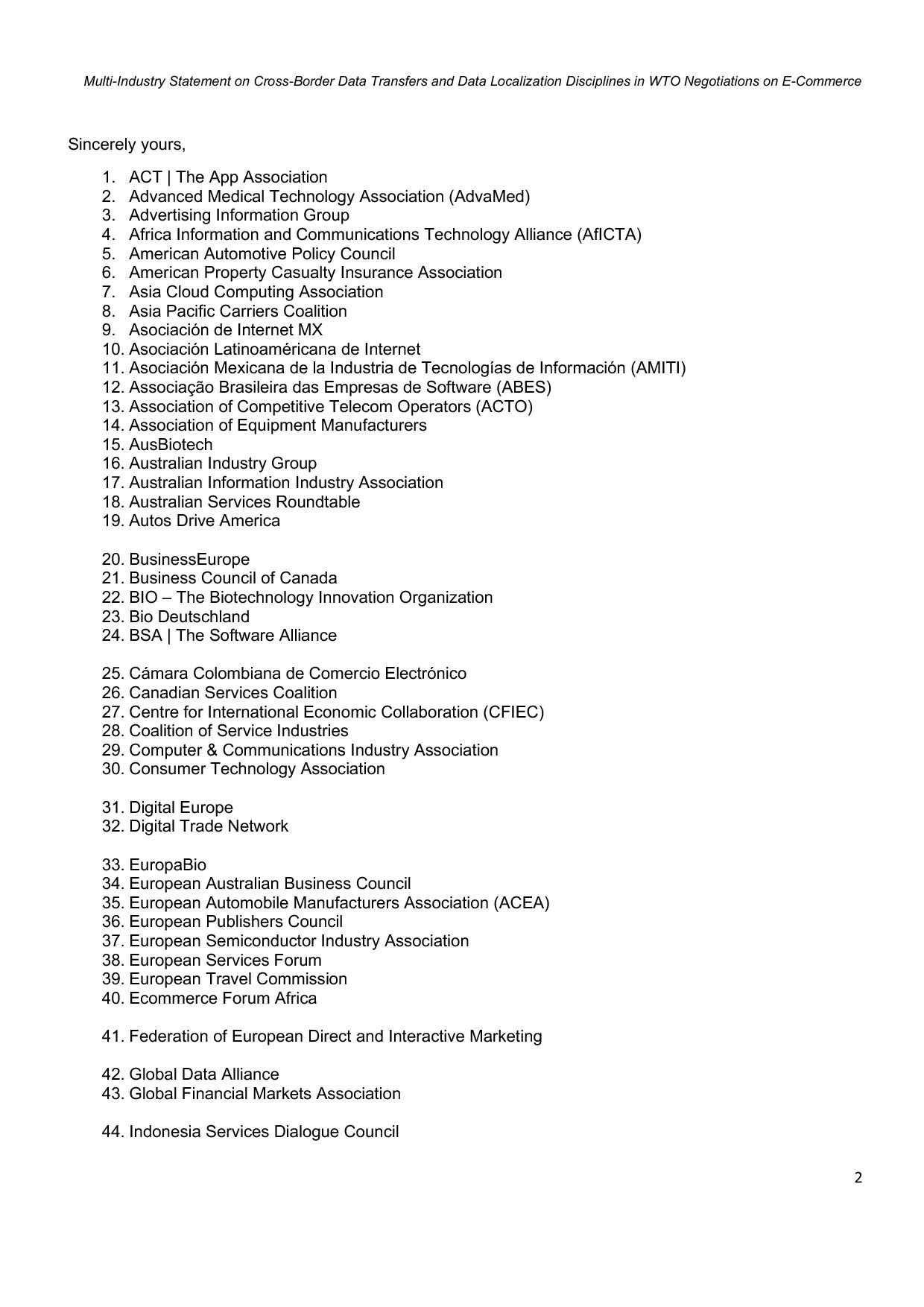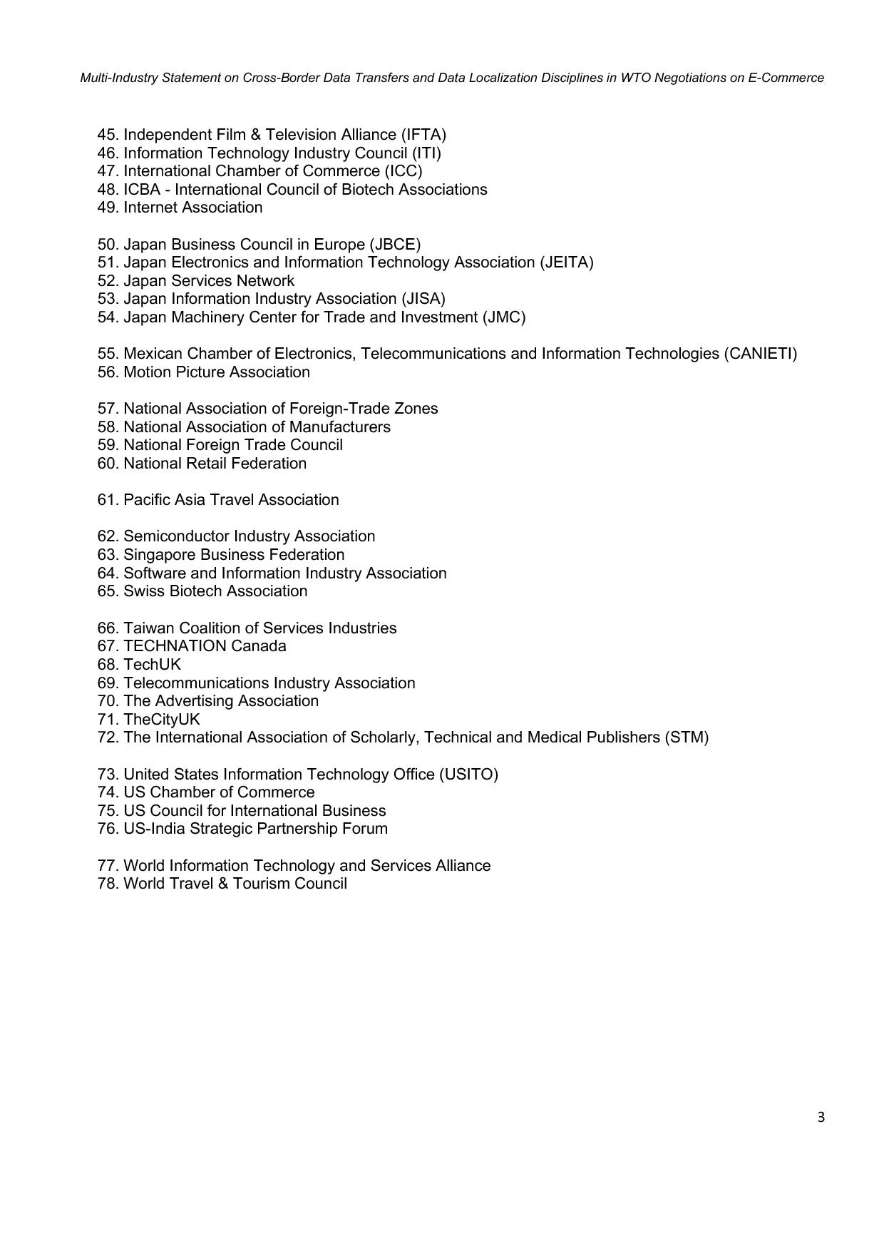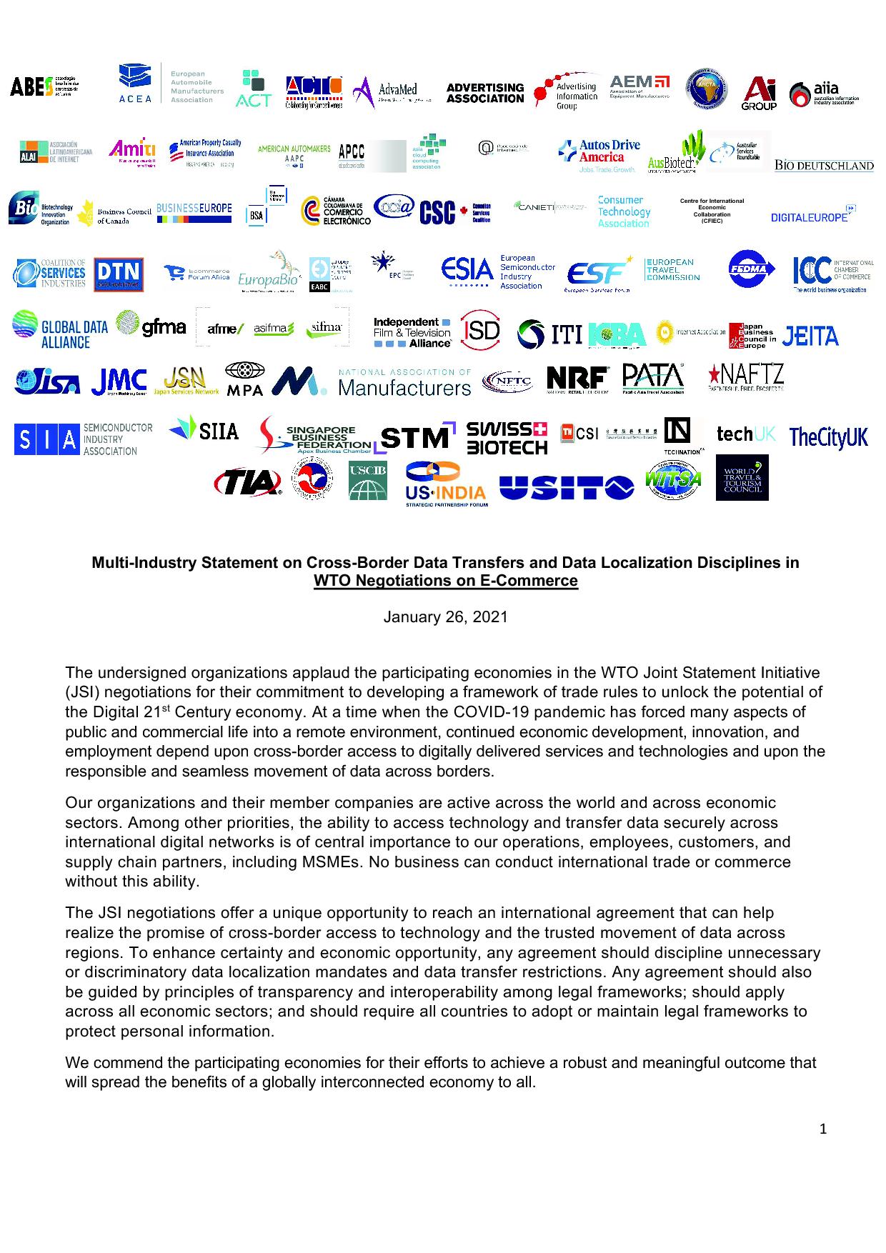 Multi-Industry Statement on Cross-Border Data Transfers and Data Localization Disciplines in the WTO Joint Statement Initiative on E-Commerce