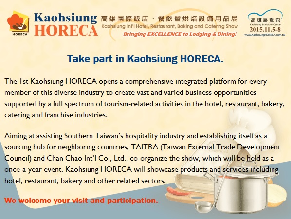 Nov 05-08, 2015Kaohsiung Int'l Hotel, Restaurant, Baking and Catering Show(Kaohsiung HORECA)