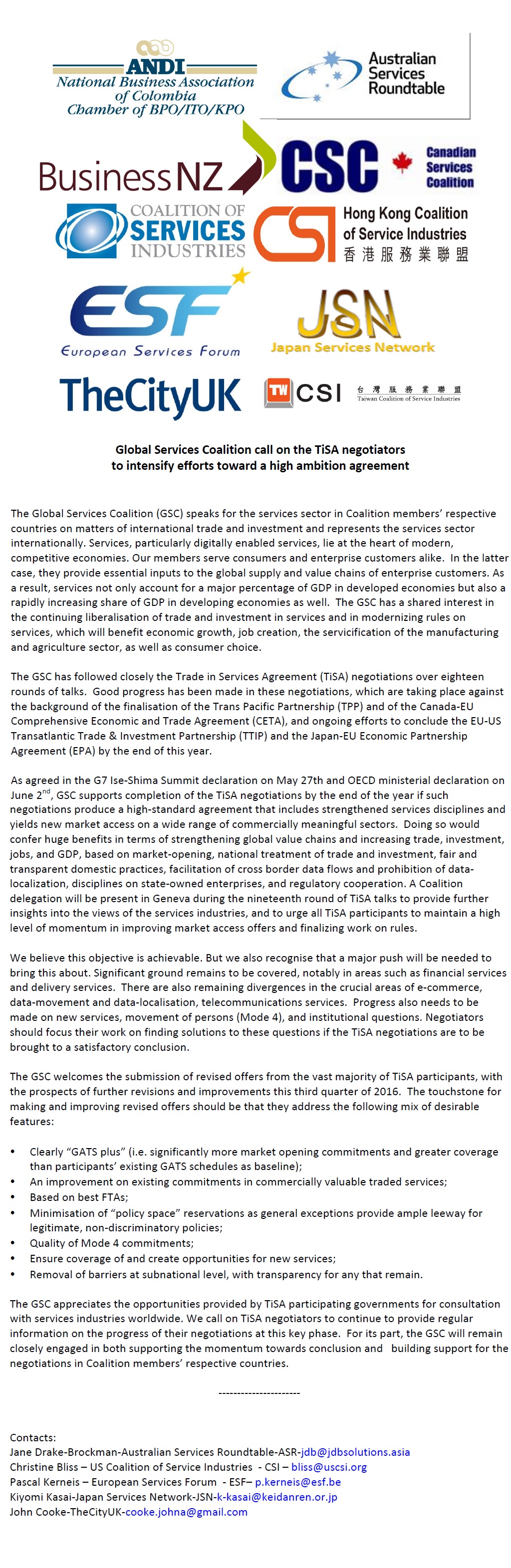 Global Services Coalition call on the TiSA negotiators to intensify efforts toward a high ambition agreement