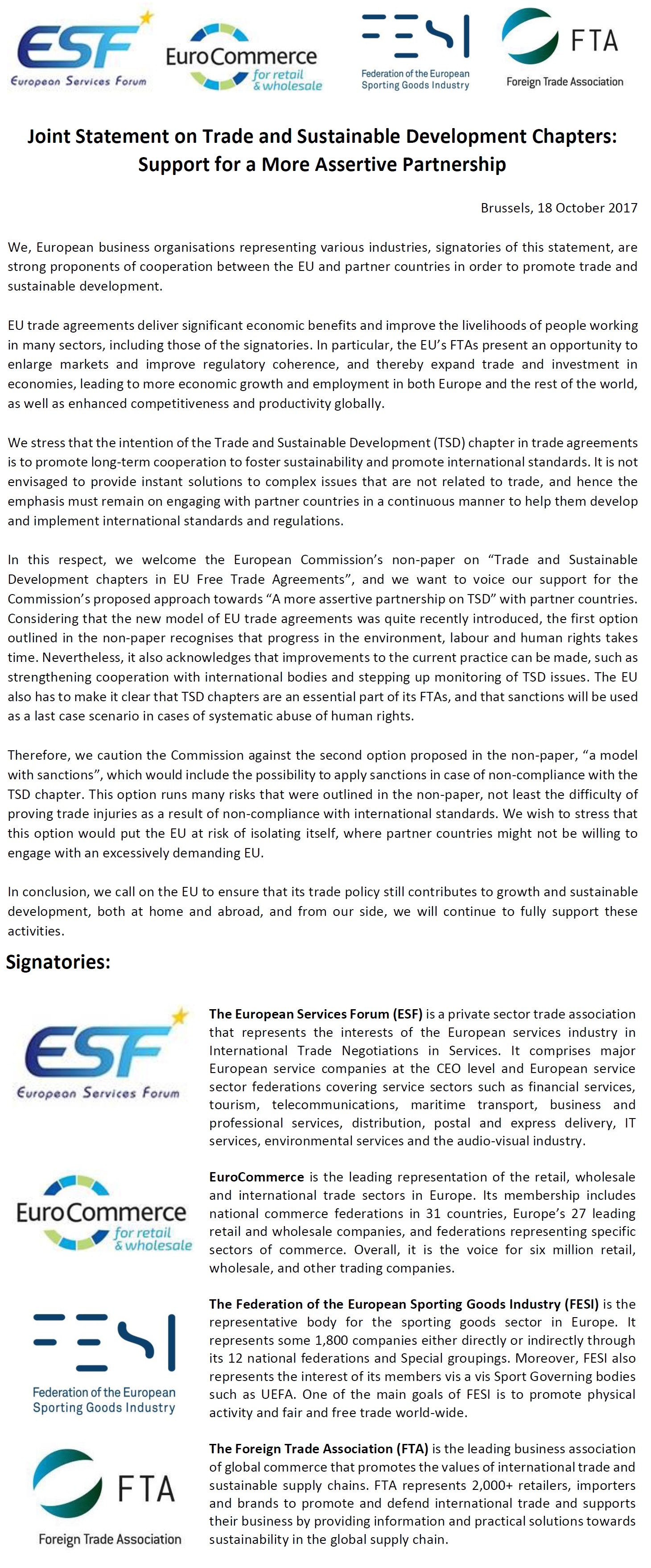 Joint Statement on Trade and Sustainable Development Chapters: Support for a More Assertive Partnership