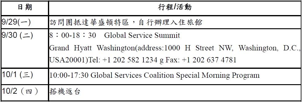 「全球服務業高峰會」由美國服務業聯盟以及全球服務業聯盟(Global Service Coalition, GSC)共同舉辦,主要針對世界貿易組織所推動之國際服務貿易協議(Trade in Service Agreement, TiSA),以及服務業在全球經濟、就業機會之創造所產生的價值及重要性進行討論。高峰會亦邀請各國經貿相關部門高階主管,以及重要服務業企業與相關民間組織共同與會。