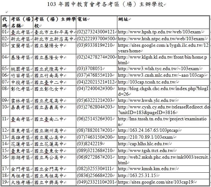 103年國中教育會考將於5月17日、18日辦理,各考區簡章將於2月10日同步公告於全國19個考區(場)試務主辦學校網站(如附件),考生可以透過國中教育會考網站(http://cap.ntnu.edu.tw)或103年國中教育會考全國試務會網站(http://cap.ntsh.ntpc.edu.tw)連結,免費下載,也可洽各考區試務主辦學校購買紙本簡章。