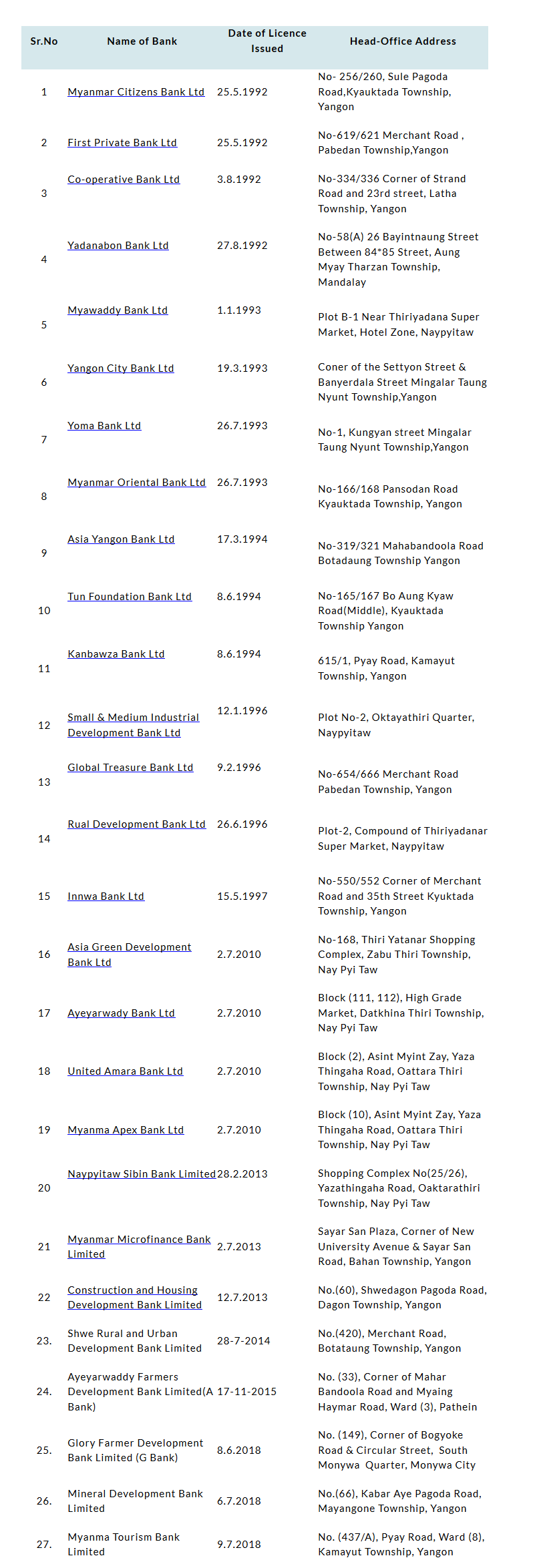 據悉目前包含新成立之緬甸旅遊銀行(Myanmar Tourism Bank),緬甸已共有27家私人銀行,名單如下: