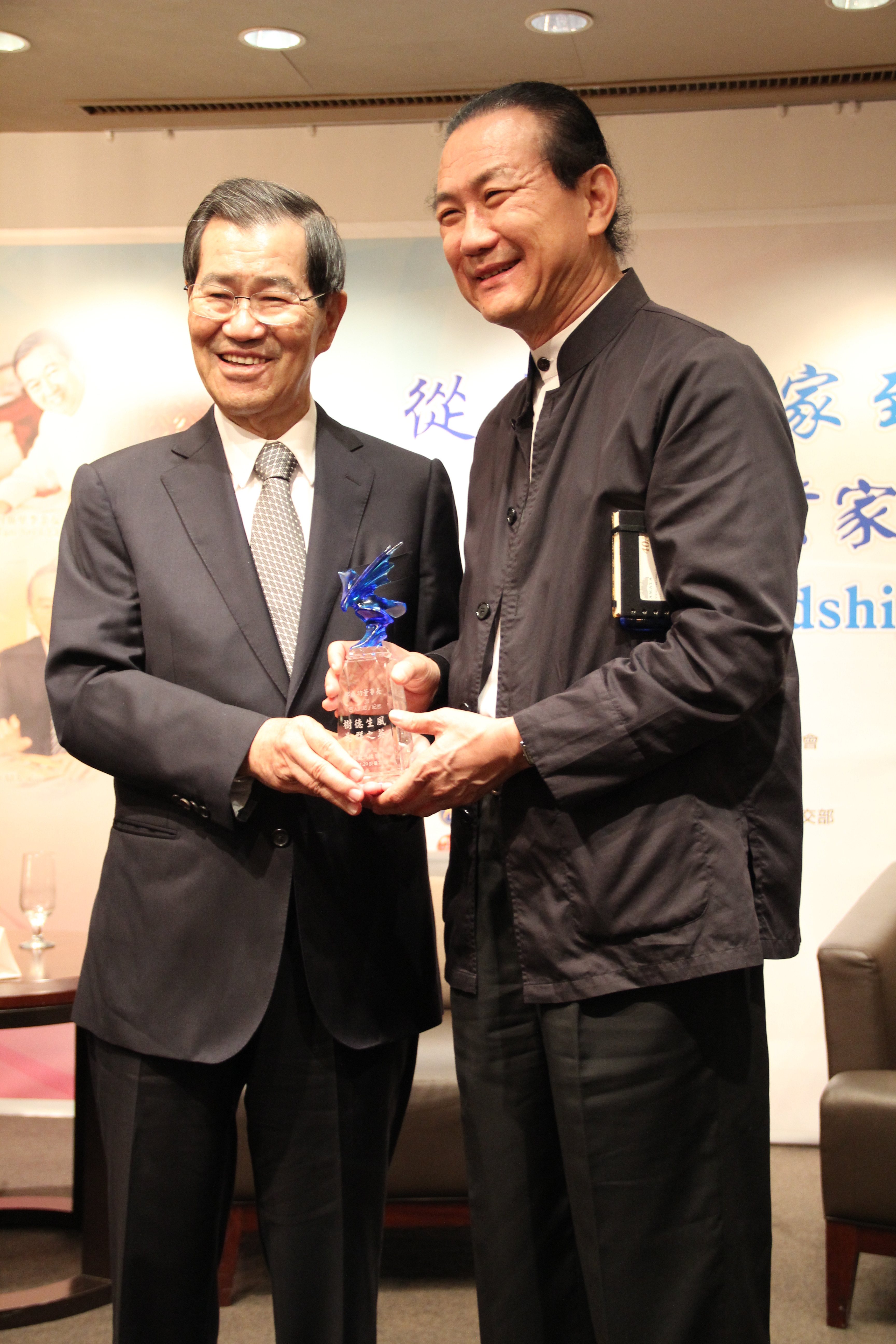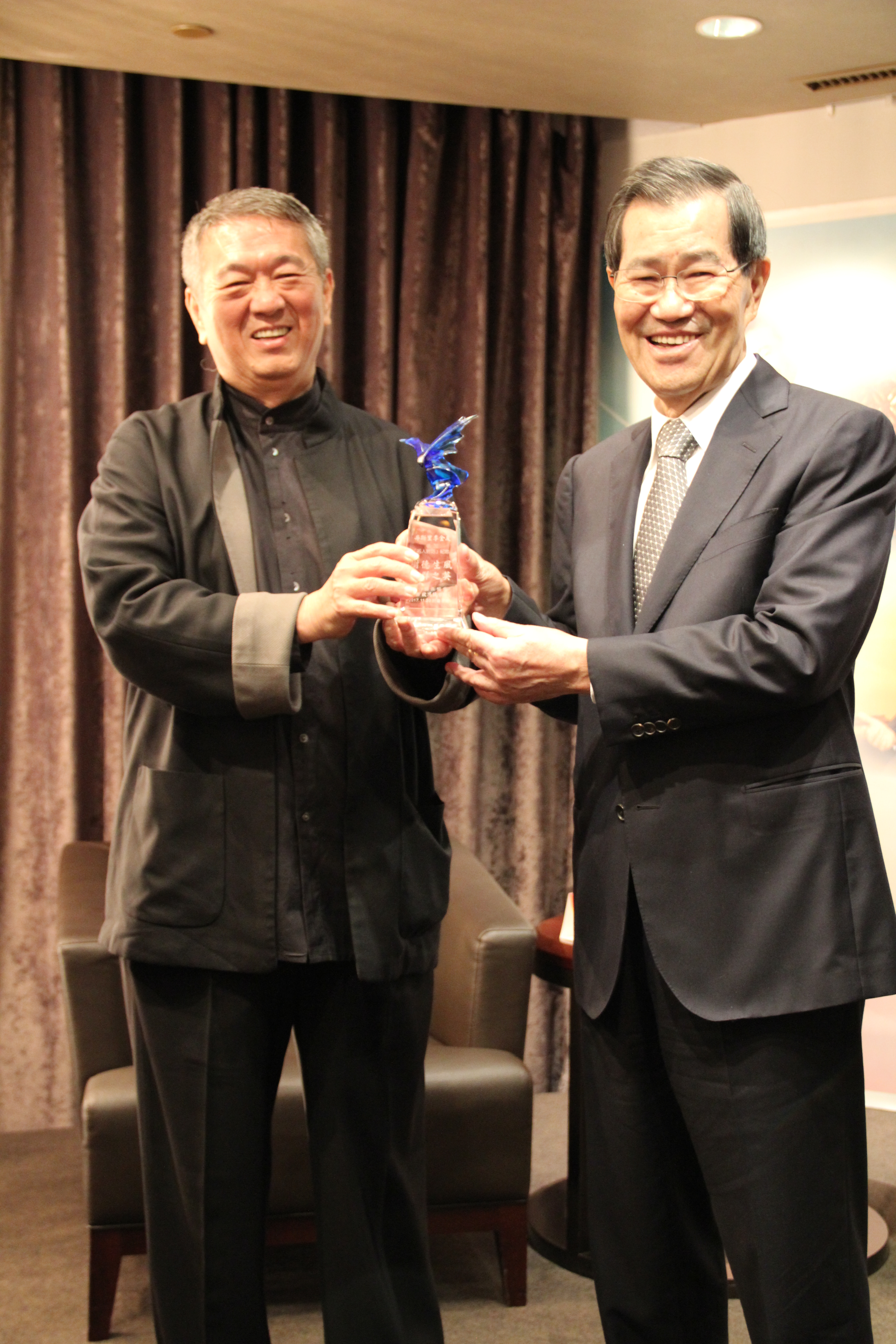 圖:蕭萬長先生致贈紀念獎盃給李金友、邱威功(由左至右)
