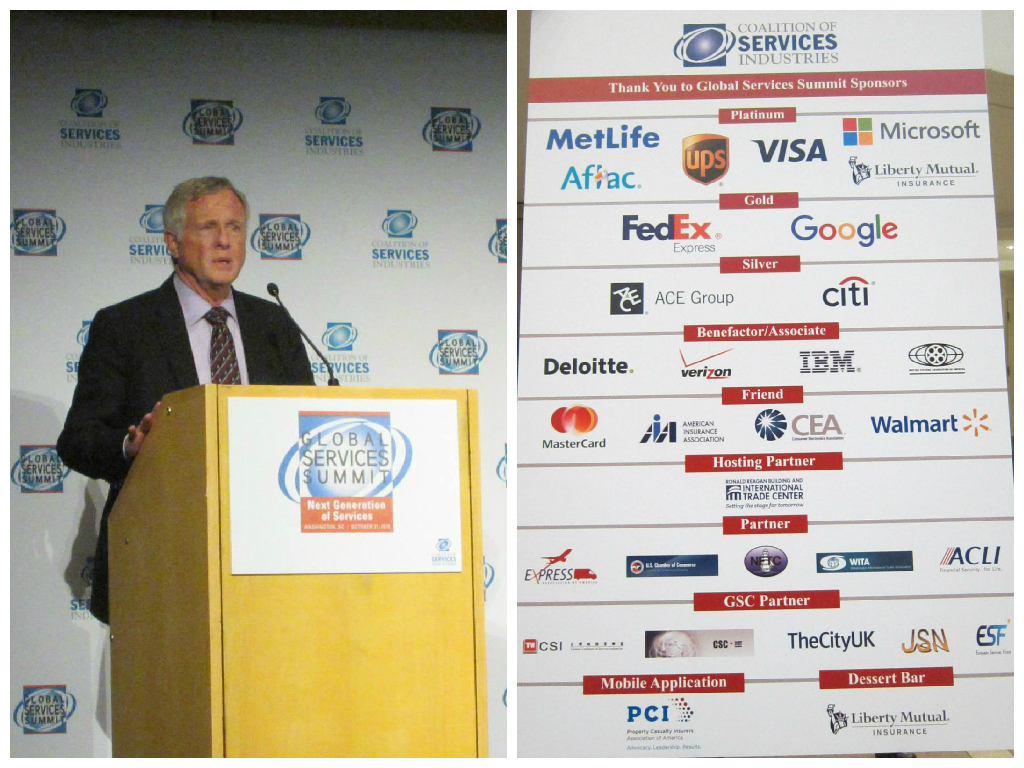 全球服務業高峰會(Global Services Summit)今(104)年10月21日於美國華府舉行,我國由台灣服務業聯盟協會與國際通商律師事務所譚耀南律師偕同經濟部經貿談判代表辦公室及國際貿易局共同出席,該會議主題為「建構服務業之未來」,議程內容包括國會議員就貿易議題進行討論、WTO及世界銀行就服務業整合性貿易資料庫、服務業於永續經濟成長之成功模式,邀請服務業高階經理人分享服務業實務議題、由TPP經驗看亞太區域貿易趨勢、新科技帶來之服務創新、及美國商務部部長對談等相關議程。