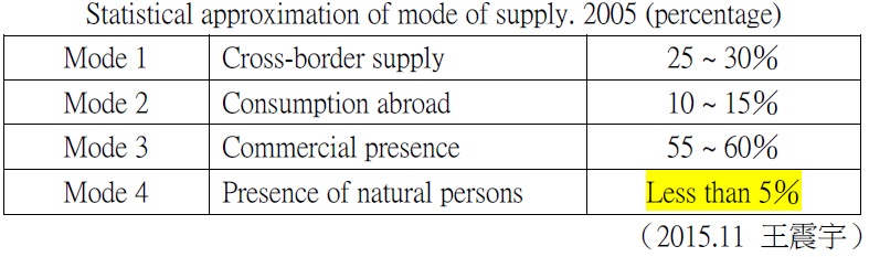 加入TPP與我建築師專業人士移動部分,其中較具有相關聯的為第10章跨境服務貿易(Chapter 10. Cross-border trade in services ),其核心義務包括WTO及其他國際協定規範之:國民待遇、最惠國待遇、市場開放(締約方不得設立數量限制、不得要求特定法人形式與合資、不得設立當地據點),包含專業服務鼓勵相互認證合作與其他議題。TPP被稱作21世紀貿易協定的高標準,是美國政府亞洲戰略軸心的經濟支柱,也是迎戰中國大陸在區域和全球影響力日增的對策。歷經逾5年談判,12個國家的貿易部長達成最終協議,將創建全球規模最大的自由貿易區,規模占全球4成的巨大經濟圈應運而生。而我建築師專業人士屬於自然人移動中的模式四(Mode 4),所占的比例小於所有自然人移動模式的全部5%以下(如下表所示)。為本身提供服務自我雇用者(Self-employed),並直接自客戶或業主取得報酬。及受服務提供者所雇用,於供給服務之過程中接受僱用人之指揮;如工程顧問公司或其他工程服務業。屬於具有專業技能、短期、商機及跨境服務的獨立專業人士(Independent Professionals, IP)。