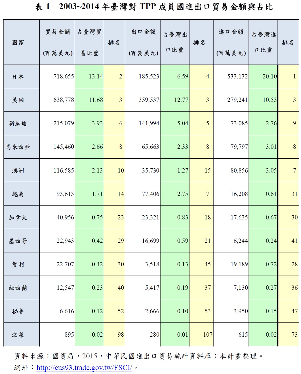 其次,許多 TPP 成員國為臺灣重要的貿易夥伴,2003~2015年間,臺灣與 TPP 十二國的經貿往來約佔臺灣貿易額的37%,占臺灣出口貿易比重約32%,占我國進口貿易比重約42%,其中美國、日本、新加坡、馬來西亞、澳洲以及越南等國係屬臺灣在TPP成員國中貿易往來較密切之國家。臺灣若能成功加入TPP,除了可以鏈接ASEAN的馬來西亞、新加坡、汶萊、越南等四國,同時亦可與臺灣第二大及第三大貿易夥伴國之美國與日本,進行經濟合作,並且深化臺灣與南美洲的智利與秘魯、大洋洲的澳洲與紐西蘭的經貿關係,因此,臺灣加入TPP,等於與各亞太主要國家完成FTA,享受關稅減免及市場開放的成果。
