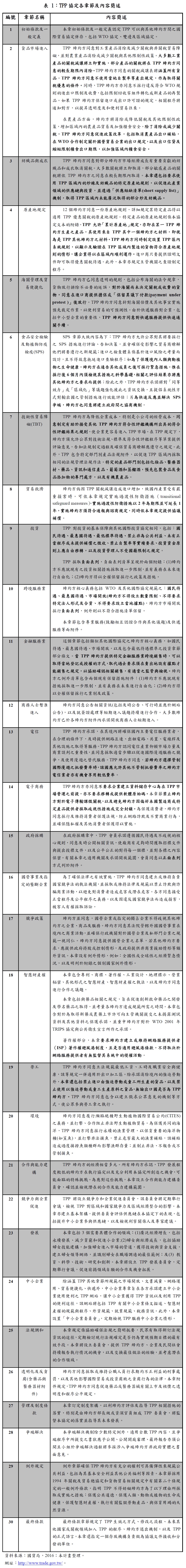 TPP係以美國為首,第一個連結亞洲、太平洋與拉丁美洲地區的區域貿易協定,其標榜「高品質、高標準、涵蓋範圍廣泛」。TPP協定範圍共計30章,涵蓋新興貿易議題及跨領域議題,例如:網路及數位經濟、國營企業、確保貿易協定有利於小型企業等。而之前爭議較多的三大棘手議題:原廠藥專利權期限 (美國與澳洲)、汽車裝配規定 (美國與日本)、乳製品開放 (日本、加拿大、美國與紐西蘭),亦達成協議,此外,為避免日本持續以操作匯率貶值方式促進出口,故限制會員國不可以透過匯率操作來提升出口和減少進口。影響協議的重點如表1: