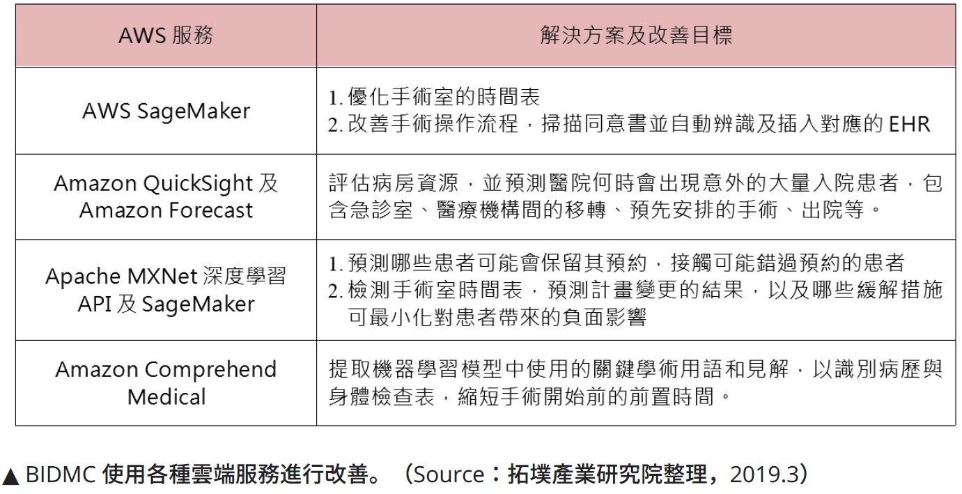 BIDMC 與 AWS 的合作使用多種 SW 服務,包含 SageMaker、QuickSight、Forecast、Apache MXNet 深度學習 API 及 Comprehend Medical 等,以進行多項研究與改善,導入 AI 後,也看到顯著成效,例如手術室使用率提升三成。由於醫院主要提供患者醫療及照護服務,患者資訊將產生大量資料,因此 AWS 資料中心以軟體技術及運算、儲存等硬體資源,提供訓練模型時完整的軟硬體解決方案。