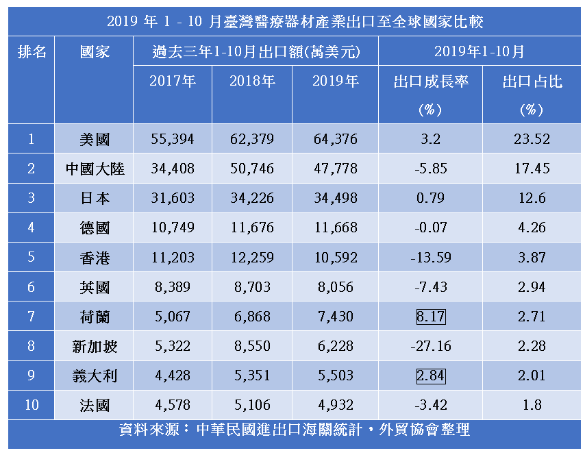 2019年1至10月前十大醫療器材市場依序為美國、中國大陸、日本、德國、香港、英國、荷蘭、新加坡、義大利、法國。前五大出口市場分別為美國6.4億美元,佔23.52%、中國大陸4.7億美元,佔17.45%、日本3.4億美元,佔12.6%、德國1.1億美元,佔4.26%、香港1億美元,佔3.87%,其中值得注意的是荷蘭和義大利成長率不容小覷,分別是8.17%及2.84%。
