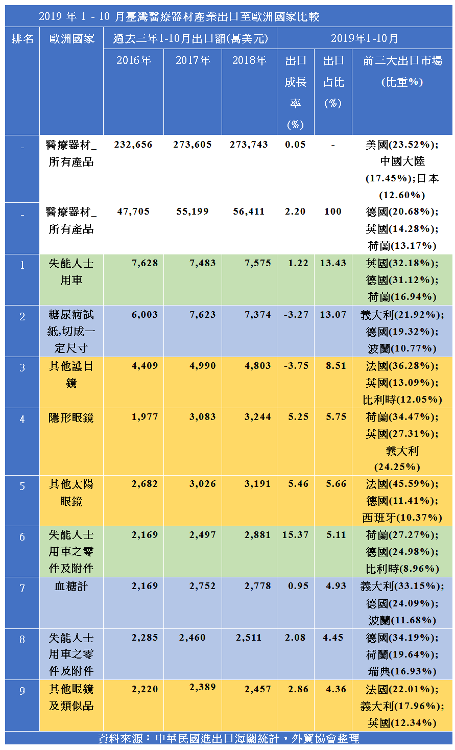 分析臺灣外銷到歐洲主要的醫療器材,主要為失能人士用車及零附件(位居第1及第6),糖尿病產品,包含糖尿病試紙及血糖計(位居第2及第7),護目鏡、隱形眼鏡、太陽眼鏡、及其他眼鏡類似品(位居第3、4、5、9)。其中就醫療器材產業而言,輪椅等失能用車、血糖計及隱形眼鏡等類似產品,皆為我目前醫療器材之強項。