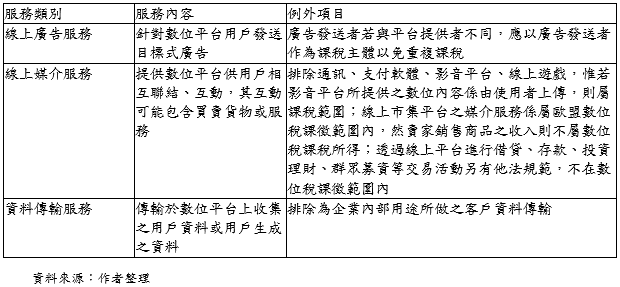 歐盟數位稅新規則草案中規定課稅交易可分為以下表列三類服務: