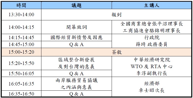 主辦機構:台灣服務業聯盟協會、全國工業總會、中華民國工商協進會、中華經濟研究院WTO及RTA中心