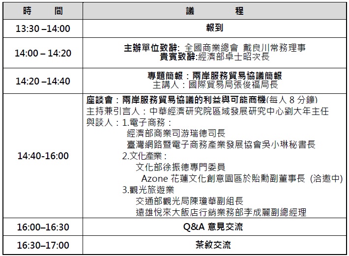 兩岸服務貿易協議談判已完成,並於6月21日完 成簽署。由於臺灣服務業相對於中國大陸具有較佳的競爭優勢,兩岸簽署此項協議,符合政府「以臺灣為 主、對人民有利」的最高指導原則,更有助我服務業布局兩岸、拓展國際商機,為經濟發展挹注更多動能。經濟部特於兩岸服務貿易協議簽署後,即委請中華民國全 國商業總會與中華民國對外貿易發展協會將於花蓮舉辦1場說明會,邀請產官學三方共同說明簽署後的商機與推動策略。會中將邀請多位主講人作重點商機介紹及策略作法,內容甚具參考價值,誠摯地邀請您出席指導。