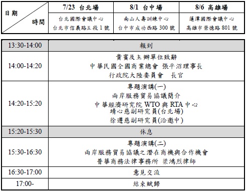 兩岸服務貿易協議是兩岸經濟合作協議(Economic Cooperation Framework Agreement, ECFA)後續四大協議之一,內容針對兩岸服務業市場的相互開放進行協商。透過這項協議,台商可以有制度的,進軍中國大陸內需市場,並和中國大陸的廠商合作,共創商機。本說明會於台北、台中、高雄各舉辦一場說明會,協助我國業者了解服務貿易協議之各項內容,並援引業界實例,協助我國業者了解兩岸服務貿易協議可帶來之潛在商機以及未來與中國大陸企業合作之機會。
