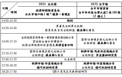 台灣服務業聯盟協會自2007年成立以來,一直致力於促成服務業者參與國際性服務業經貿活動,希望增進業者與國際企業的交流機會,更進一步提高業者對國際參與之興趣。今(103)年,台服共計出席了全球服務業論壇在5月間於日內瓦舉行的TiSA會議、9月新德里出席臺印雙邊會議、9月底帶領服務業者出席在美國華府舉行之「全球服務業高峰會」,及10月在馬來西亞參與台馬雲端商務產業高峰論壇等等項國際性活動。為讓國內服務業者及政府相關單位有機會瞭解該些活動之實際進行情形,本會特規劃「2014年台服服務業業者國際參與經驗分享座談會」,歡迎踴躍報名參加。