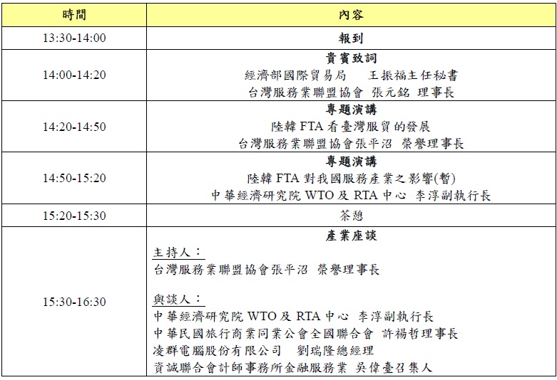 中國大陸與韓國於日前簽署自由貿易協定,針對服務貿易及投資、法規與合作等領域有十足的突破,使臺灣過去在兩岸服貿協議所取得的先機漸漸失去。鑒於此,本會偕同台灣亞太產業分析專業協進會,邀請產學專家針對臺灣服務業的因應之道與未來發展情況共同討論,避免臺灣遭受邊緣化,並促進臺灣服務產業的競爭力。