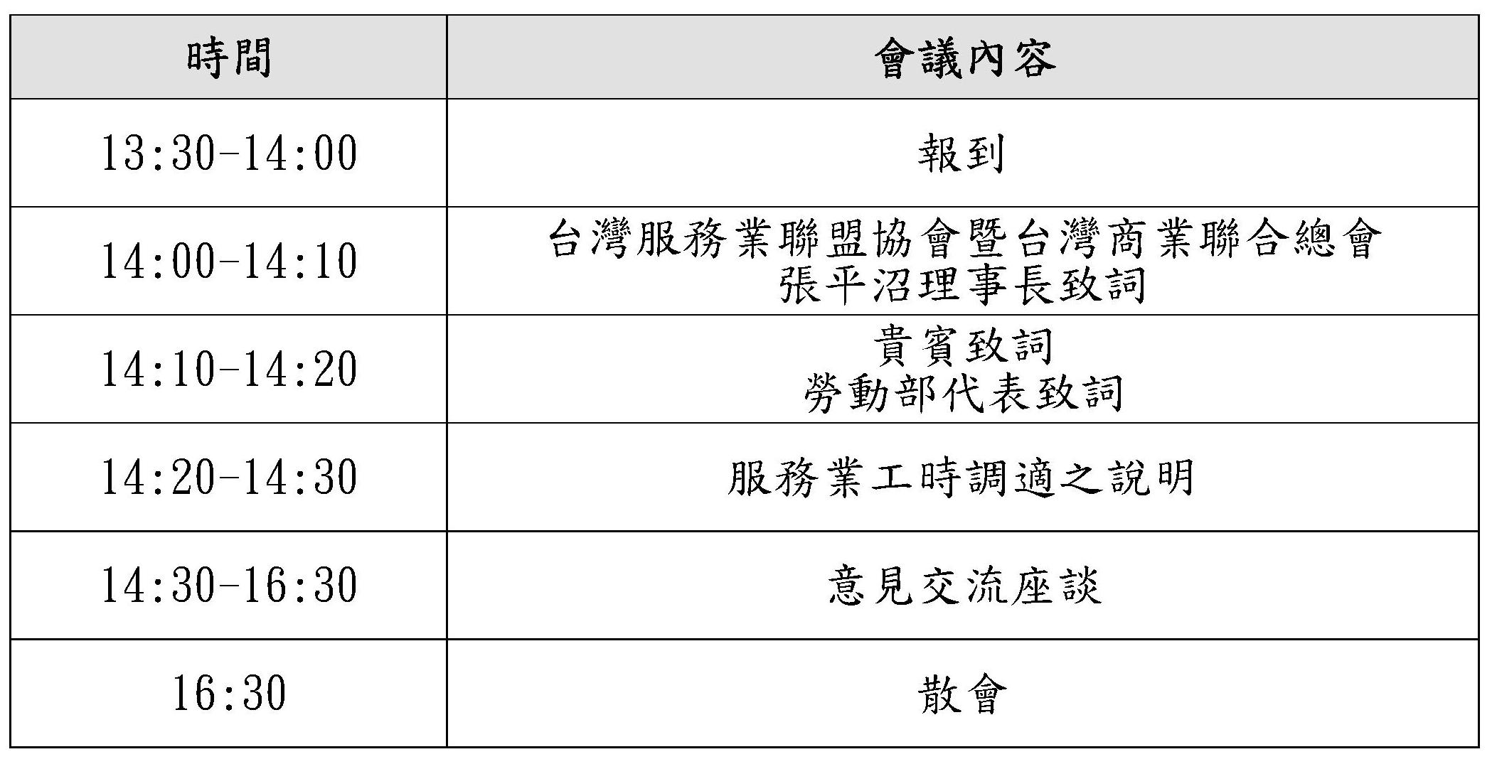 鑑於工作與生活之平衡已為重要之國際勞動趨勢,勞動部考量工時調整勢必影響企業經營成本及人力調度運用,且服務業者反應現行之勞動基準法工時規定缺乏彈性,對於服務業多元化發展及商業運作模式之改變有所影響,為能瞭解事業單位在適用該法工時規定之現況,搜集產業現階段面臨之工時相關問題,以作為未來法規調適之參考。特於 12 月 23 日舉辦工時調適座談會,聆聽服務業者適用勞動基準法工時規定之窒礙難行之處,並協助解決問題,會議中開放意見交流座談,敬邀 企業賢達踴躍與會,提供產業對工時規定之實務運作情形與建言,以利政府政策研議整體規劃與參考。