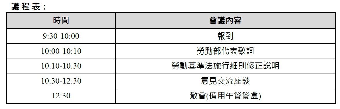 自本(105)年1月1日起,由「每2週84小時」縮減為「每週40小時」。因此,勞動部擬具「勞動基準法施行細則」部分條文修正案,於去(104)年12月9日發布,同步自本(105)年1月1日施行。修正重點包括:刪除童工之基本工資不得低於基本工資70%之規定、修正延長工作時間之定義、明定出勤紀錄之記載方式、國定假日調整為全國一致並保留勞動節(由19日調整為12日),以及明定國定假日補假原則等。立院衛環委員會於本(105)年3月28日審查「勞動基準法施行細則部分條文修正案」,認為第23條國定假日之修正顯然違反母法及法律保留原則,決議不予備查。然產業現階段面臨之工時相關問題,任何變動都將影響企業營運,為減少衝擊,特加強產業溝通,以減緩企業對於人力及工時安排之疑慮以作為未來法規調適之參考。特於 5 月 10 日舉辦工時調適座談會,聆聽服務業者適用勞動基準法施行細則修正規定之窒礙難行之處,並協助解決問題,會議中開放意見交流座談,敬邀 企業賢達踴躍與會,提供產業對工時規定之實務運作情形與建言,以利政府政策研議整體規劃與參考。