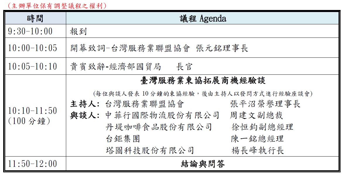 過去台商較著重東協國家之製造業產能,惟近來東協服務業興起,亦有業者看中此波趨勢,積極拓展服務業商機,且有累積一些服務業輸出之成功案例。本會特邀請我臺商在東協市場經營有成的服務業企業分享其經驗與看法,敬請 踴躍出席參加。