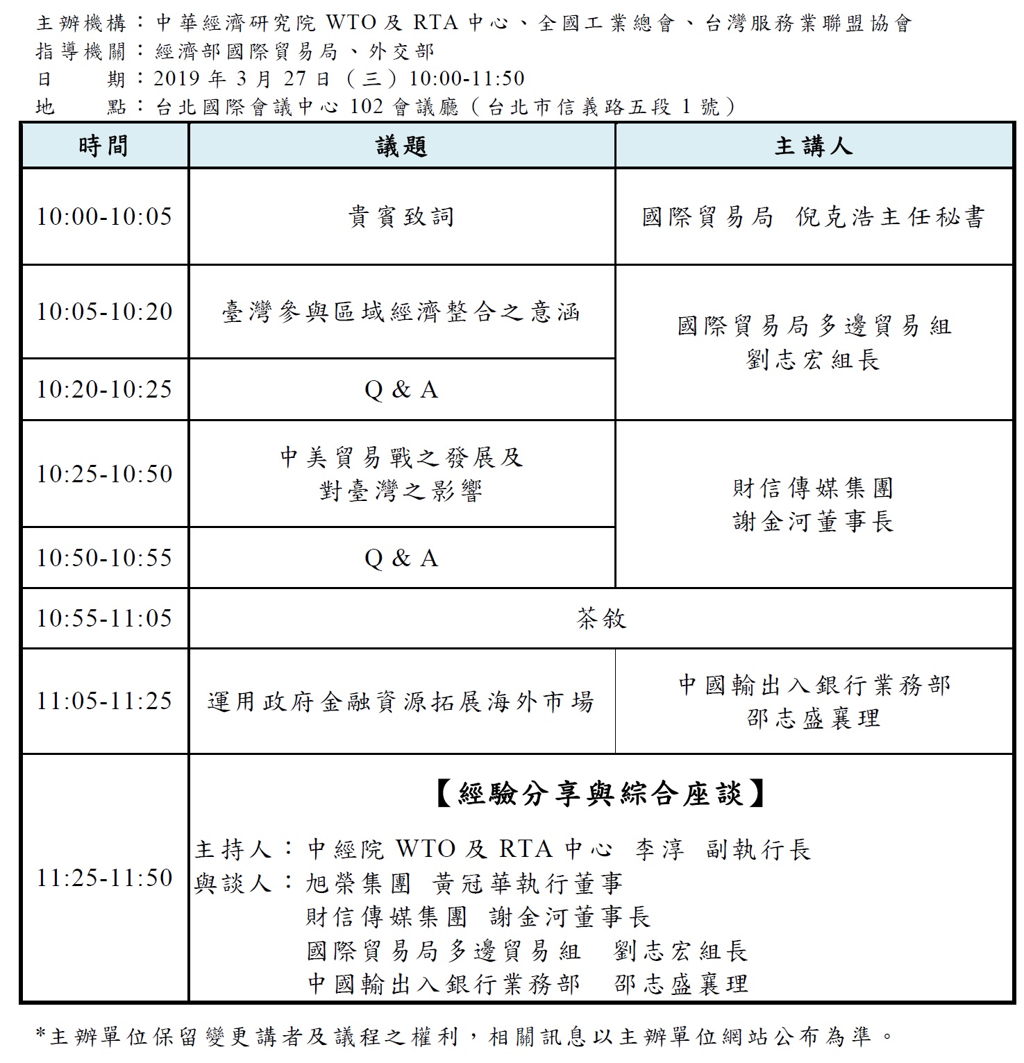 主辦機構:中華經濟研究院WTO及RTA中心、全國工業總會、台灣服務業聯盟協會