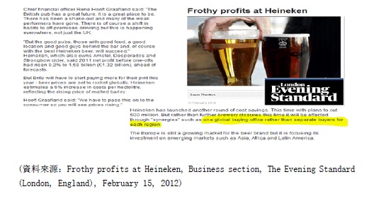 (資料來源:Frothy profits at Heineken, Business section, The Evening Standard (London, England), February 15, 2012)