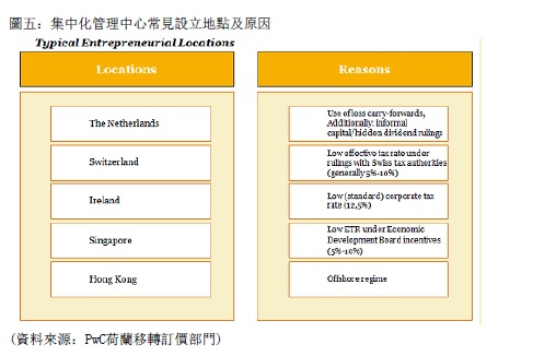 此類的集中化管理中心,時常設立於許多可將有效稅率降低的國家,常見的國家包括荷蘭、瑞士、愛爾蘭、香港及新加坡 (請參見下圖五)。每個國家將有效稅率降低的方式有所不同,瑞士及新加坡利用給予有利租稅函令的方式降稅,愛爾蘭透過極低的法定公司稅率,香港透過適用海外所得不課稅的方式,而荷蘭則是透過與稅局簽訂特殊形態的合約 (預先定價協議)。