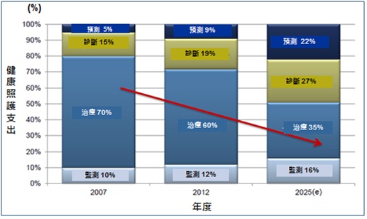 根據Frost & Sullivan的2012研究資料顯示,由於不斷上漲的醫療費用,相關的健康照護服務模式和解決方案不斷地推出下,2010年至2020年之全球健康照護支出的趨勢為,預防性健康照護和預防醫學、診斷類的健康照護、監測類的健康照護等之比例逐漸增加,其中預防性健康照護和預防醫學由2007年的5%增加為2012年的9%,預估2025年將達22%、診斷類的健康照護的比例逐漸增加,由2007年的15%增加為2012年的19%,預估2025年將達27%、監測類的健康照護的比例逐漸增加,由2007年的10%增加為2012年的12%,預估2025年將達16%,而原本所佔比例最高的治療類健康照護則逐漸減少,由2007年的70%減少為2012年的60%,預估2025年約僅35%。亦即,未來預防保健、養生保健、健康管理和預防醫學等相關的健康照護服務將愈趨普遍,且比例將逐年增加。(參考圖一)