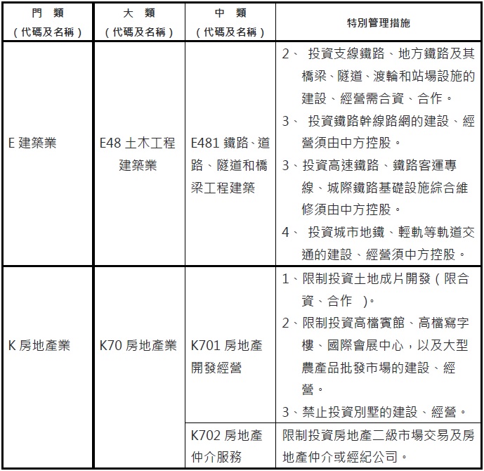 「上海自由貿易試驗區」的制度裡尚有“負面清單” (Negative List),在負面清單上,中國大陸明確開列不允許外商投資或有限制要求的領域,而在清單以外的領域則給予充分開放。涉及製造業、建築業、金融業、房地產業等18個行業門類,共有190條外商准入特別管理措施。這意味著約有17.8%的小類有特別的管理措施。在負面清單之外的領域,「上海自由貿易試驗區」的外商投資專案核准改為備案制(中國大陸國務院規定對中國大陸國內投資項目保留核准的除外),外商投資企業合同章程審批改為備案管理。其中 E建築業(E481鐵路、道路、隧道和橋梁工程建築)及K房地產業(K701房地產開發經營、K702房地產仲介服務)等二項。