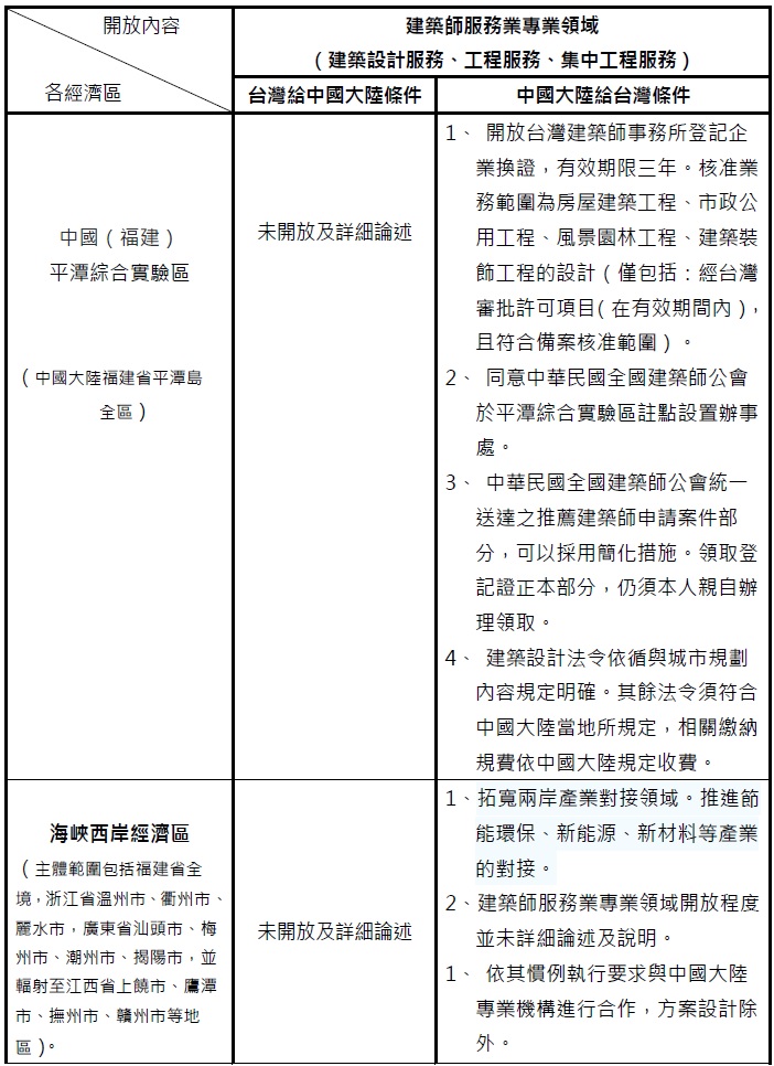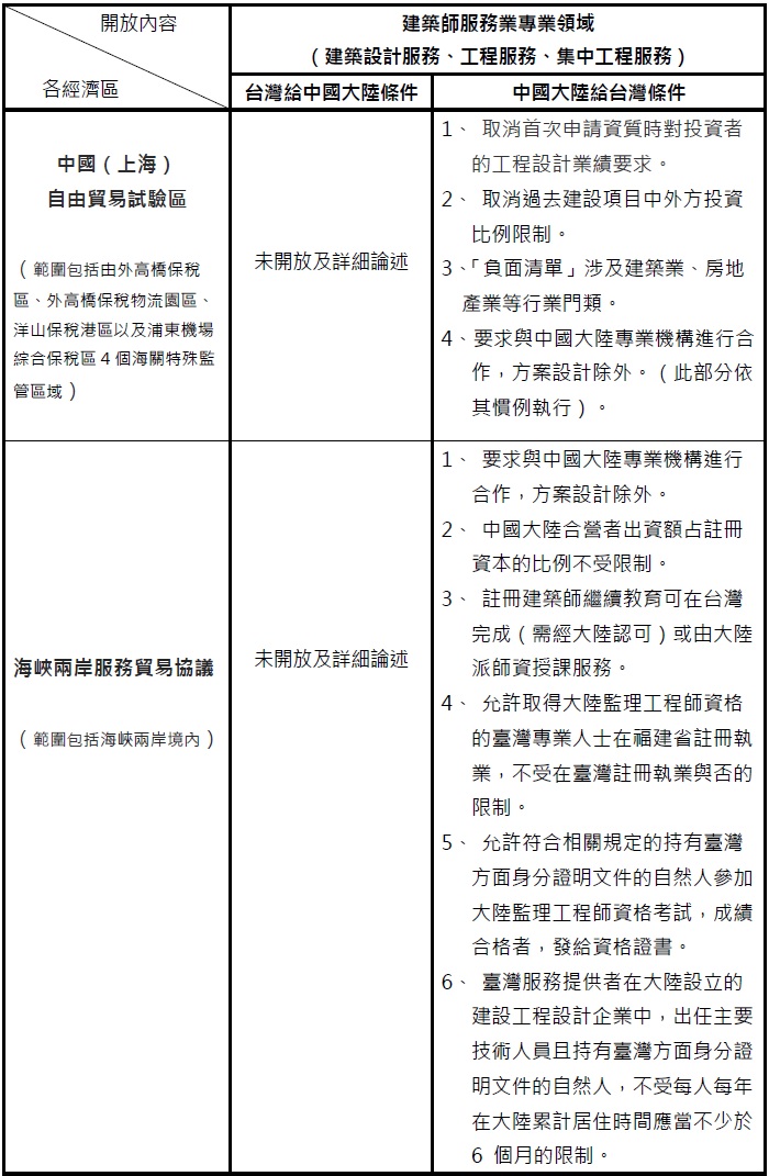 在「上海自由貿易試驗區」內,除投資者可以考慮購買辦公用房、商用店鋪。個人可以依自己身份開立銀行帳戶。對專業服務領域開放與台灣建築師有關部份為:專業服務領域中