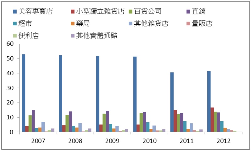 而從銷售通路來看,可以發現目前越南美容保養品通路分佈以獨立小型雜貨店、美容專賣店、量販店為主要銷售通路。其中獨立小型雜貨店大多散佈在路邊,並且在各區域會有設立,為個人開設經營,此外也多設立在傳統市場裡面,越南傳統市場則闢有加工食品、成衣、化粧品、飲料、手提袋、家電、電子產品等消費品零售攤位,例如胡志明市的安東市場與檳城市場。其主要產品以當地產品為主,但是少部分會販賣國外品牌之水貨產品,除了一般消費者購買產品外,也提供胡志明外其他周遭小城市的小批發商來購買,批貨後回到自己經營的小雜貨店販賣。美容專賣店提供消費者可以一次買齊不同品質、不同價格的保養品,會有銷售人員進行介紹,其主要還是販賣有品牌之產品,但是有時候專賣店的產品品質有時會堪慮,主要是因為會販賣水貨以及仿冒品,或是販賣不知名品牌之產品。而量販店特別是針對中階到低階之品牌產品,當然單價低的產品也比較會進入超市/量販店通路。而品牌進入時必須支付上架費用,對於一些小品牌或是弱勢品牌難免會造成很大的成本壓力。