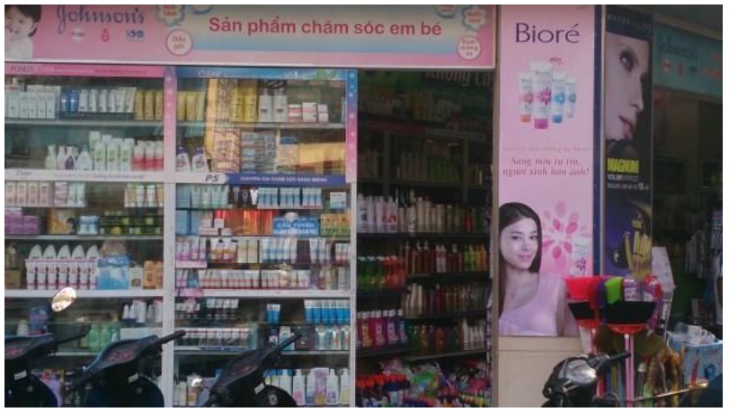 當探討護膚品銷售通路佔比時,可以發現與美容保養品的通路銷售分布有所不同,護膚品的主要以美容專賣店的銷售為主,維持在40~50%的佔比,主要在於越南在街邊或是在某些商圈裡,非連鎖的獨立小型美容保養品專賣店,他們像是一般雜貨店的形式,裡面堆放許多品牌之護膚品,其外觀如同下圖4所示。