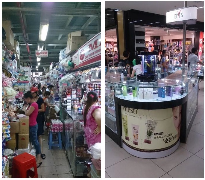 所謂現代化通路(超市、量販店、便利店)之販賣佔比持續增加,但是有趣的是原本在2007-2010年都是比傳統通路(小型獨立雜貨店)佔比高,但是到了2011年之後,小型雜貨店成為護膚品銷售通路中排名第二,僅次於美容專賣店。推測主因在於越南工商部鼓勵優先在農村地區建設上千座零售賣場,並且針對每個鄉鎮撥發3億盾建設傳統市場及便利商店等通路據點,地方政府將著手規劃農村商業通路發展基礎建設,2011年完成相關規劃,中央政府將授與開發商減50%營業所得稅、免土地使用規費、土地租價優惠、融資優惠等待遇,上述的相關政策促使各地興建像是小型批發市場的傳統市場通路(如圖5),許多小型獨立雜貨店成立。甚至有些結合傳統市場和商業賣場,整建傳統市場成為兩層樓建築,底層繼續傳統零售經營方式,樓上則為現代賣場,河內最近便採用此模式發展零售業,像是臺灣量販店商場經營一樣,二樓為量販賣場,但是一樓有許多小店經營,而可發現擺在一樓的美容保養品小專櫃都是以韓國品牌為主。(圖5)