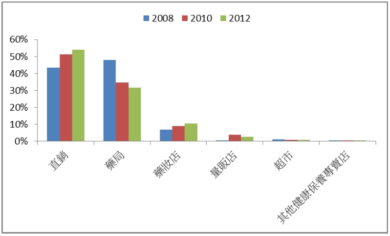 此外還有一些人隨著經濟成長,健康保健資訊接受越來越多,開始注重所謂的預防保健觀念,而這些消費者開始轉變朝向品牌與國家印象為主的連銷通路模式購買保健食品,可發現現代化通路(藥妝店、量販店、超市)的銷售占比增加,其中又以藥妝店持續穩定成長。