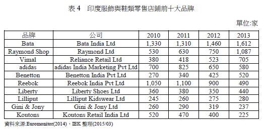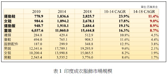根據印度成衣服飾的市場銷售數字可發現2014年印度成衣服飾市場規模達497.6億美元,其中銷售前三的品項為男裝、女裝與童裝。但是從年複合成長率來看,未來將以運動鞋、女鞋、運動服、孩童服飾為主要成長高品項,皆高達8%以上。