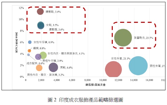 如果再從印度市場銷售額的年複合成長率與銷售總額來看(見圖3),可以發現年複合成長率排名前4的品類分別為運動鞋、女鞋、運動服、孩童鞋衣四大類。