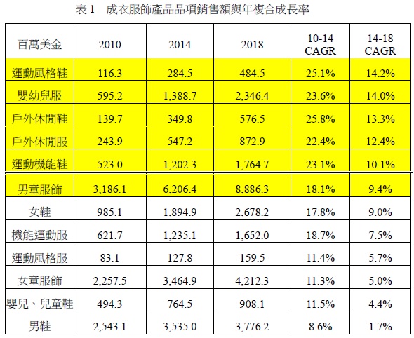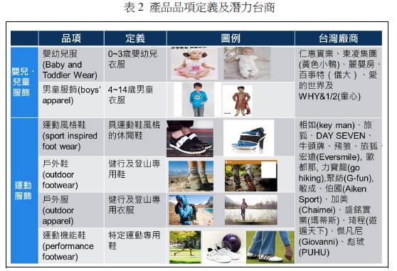 接著再根據其中銷售品項進行分析(見表1),可發現年複合成長率高之品項,運動風格鞋、嬰兒服飾、戶外休閒鞋、戶外休閒服、運動機能鞋、男童服飾為排名前幾之品項,其產品定義與台灣廠商說明如下表2。