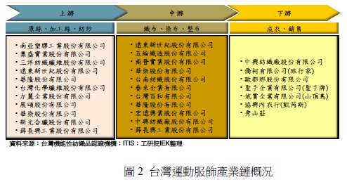 台灣目前在運動服飾的產業能量方面,除了在上游原料及紡紗技術上已具有國際水準外,在布料開發及成衣的發展上已逐漸往自有品牌模式經營。在布料品牌方面,主要包含:宏遠─EverTek、新光合纖─ZhuTech、福懋─Abletex、昶和纖維─Anti-Microbial Fabric、力寶龍(力麗集團)─SecoTec。這些品牌產品多從事於防曬、防風、防寒、竹炭、防水、抗菌除臭及吸濕排汗等布料的應用。在成衣品牌經營方面,主要包含:歐都那(Atunas)、旅行家(Tourist)、山頂鳥、秀山莊、聖手牌、凱芮斯(Caresse)等。終端產品多屬於運動服飾、登山用品、泳衣、襪子、調整型內衣等。