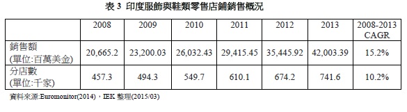 隨著印度經濟成長跟可支配所得增加,消費者在服飾與鞋類的相關花費,也逐漸提高,也帶動了服飾與鞋類相關零售通路的發展,其中以服飾與鞋類的專賣零售店(像是品牌零售店、成衣服飾專門賣場等)為主要通路,在服飾與鞋類整體通路在2013年占比達83.7%,並且成長幅度高,持續以2位數的成長率成長,在2013年達到420億美金的銷售額,其中零售據點的家數也越來越多,也有2位數的成長率。