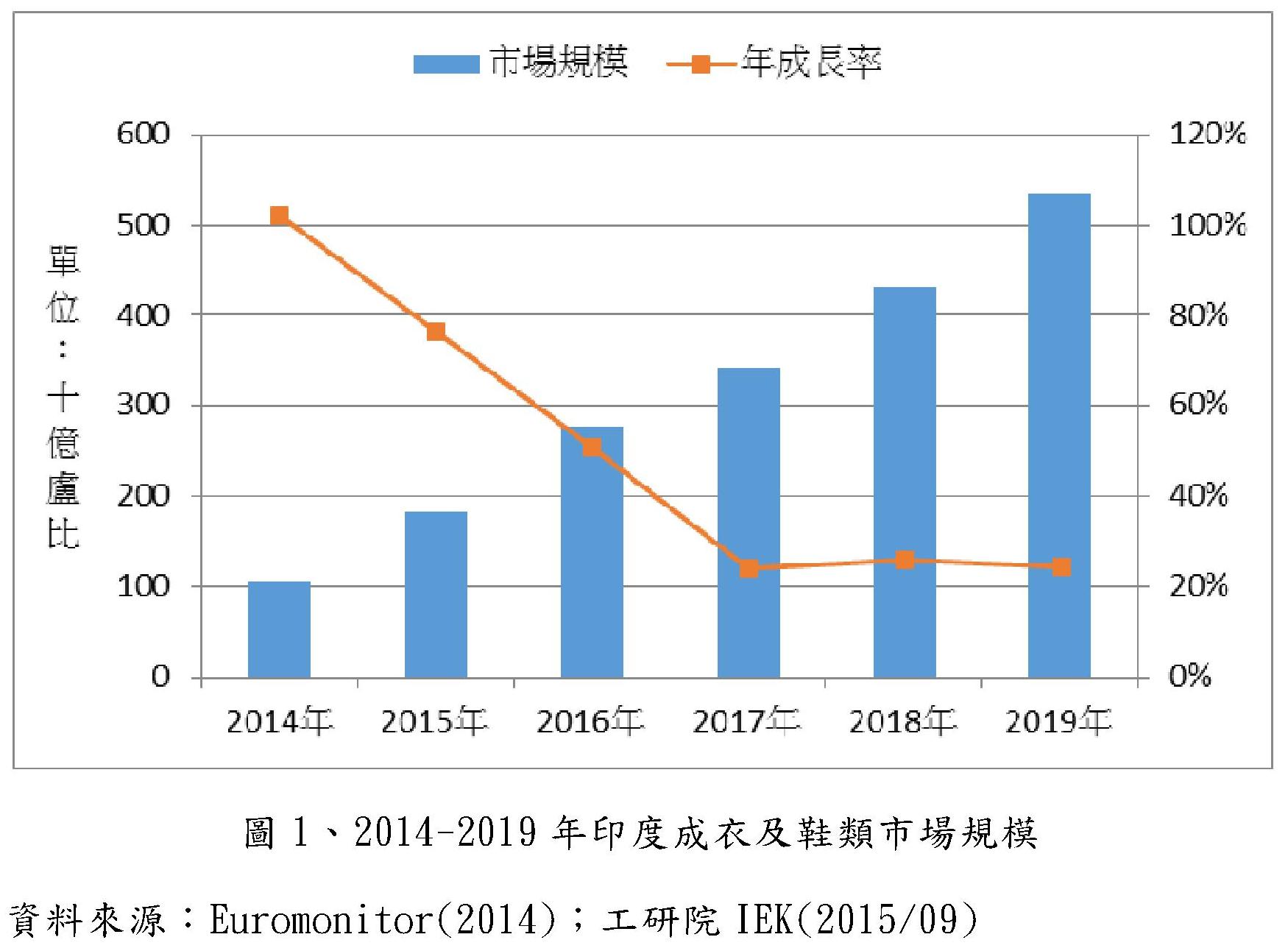 印度為人口眾多,出生率高,根據CIA估計,2014年印度0-14歲人口約占總人口的39%,且印度人注重家庭,在經濟收入提升的情況之下,也願意滿足為家中的嬰幼兒日常所需。Euromonitor(2014)的預估,印度童裝市場在2014-2018年的年複合成長率約有8%以上,足以見得印度童裝市場潛力。由Euromonitor(2014年)資料也顯示,2014年印度網路成衣服飾銷售占整體網購物市場的25%,預估2019年可達34%。然而印度網路零售市場於2014年有大幅度的成長,尤其在成衣及鞋類市場成長力道強勁,2014年之年成長率高達102%,至2019年持續呈現逐年成長的趨勢,雖然至2017年成長趨緩,但預估仍有25%的成長率。